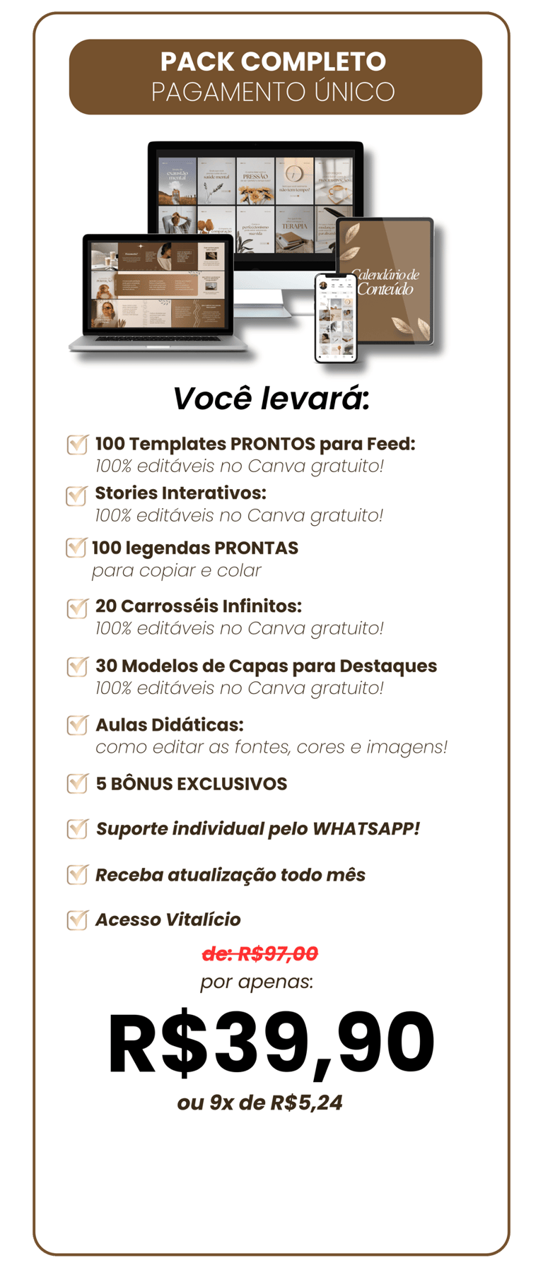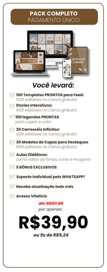 Desbloqueie instantaneamente mais de 100 modelos exclusivos do Psico Pack, totalmente editáveis no Canva gratuito, e faça do seu Instagram um imã poderoso de clientes!